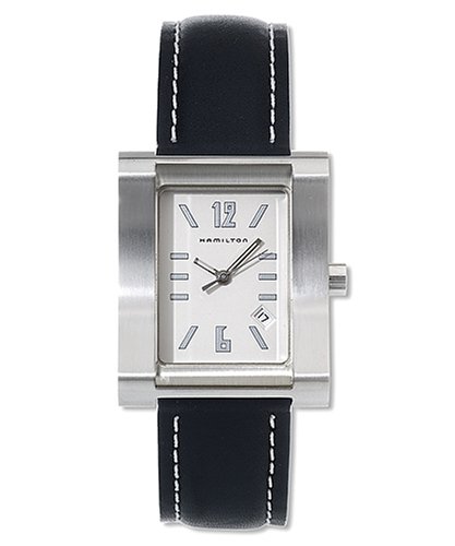 A tailored-looking watch with retro appeal, the Men's Gramercy from Hamilton will take you anywhere in style. The rectangular steel case frames a crisp white dial with baton hands, including a seconds hand, gray baton markers and Arabic numerals, and a date display between 4 and 5 o'clock. A black leather strap with white topstitching completes the look. This Hamilton watch features reliable Swiss quartz movement and is rated water resistant to 30 meters.pstrongAbout Hamilton/strongbr Founded in Lancaster, Pennsylvania, in 1892, the Hamilton watch company has a history that parallels American history itself. Hamilton crafted watches for the railroad industry at the turn of the century, for the major airlines during the commercial aviation boom of the 1930s, and for American soldiers during both world wars. Ever since Elvis Presley sported a Hamilton Ventura in his film iBlue Hawaii/i, Hamilton has been closely tied with Hollywood. Hamilton created the futuristic timepieces for Stanley Kubrick's classic film i2001: A Space Odyssey/i, and its watches have been featured in more recent blockbusters, including iMen In Black/i and iLethal Weapon/i. The Hamilton brand consists of two distinct lines. The American Classics collection combines elegance with a dash of nostalgia for the golden age of Hollywood, while the sporty Khaki collection, inspired by the original wartime watches, is technical, adventurous and tough. All Hamilton watches are expertly crafted, using precision Swiss watch movements.