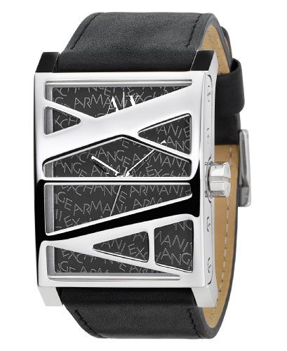 A bold clash of classic style and graffiti-like aesthetics distinguish this fine men's watch from A|X Armani Exchange. Black leather strap. Silvertone stainless steel rectangular case with logo design rectangular dial. Quartz movement. Water resistant to 50 meters. Two-year limited warranty.