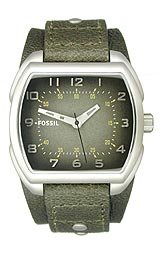 The only thing subtle about this watch is the slightly degraded dial. Everything else--the dark green leather strap, the brushed stainless steel case, the slightly rectangular shape--says bold. From timeless classics to the latest fashions, Fossil is sure to have the timepiece that perfectly compliments your unique sense of style. Founded in 1984 when timepieces were created more for function than fashion, Fossil began to transform this notion with its unique combination of vintage 1950s Americana design and affordably accessible cool style. Adding to their collectability were the one-of-a-kind, trademark tins that came with the watches that mixed a creative spirit with a sense of humor. These iconic boxes are nearly as popular as the watches they hold and are regularly collected and traded throughout the world at flea markets, antique shops, and on eBay.