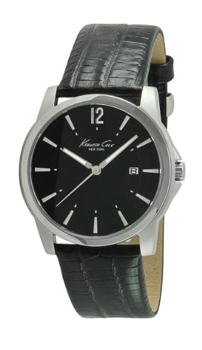 Fine lizard-embossed black leather adds a touch of specialty to this sleek Kenneth Cole New York watch. Round stainless steel case. Black sunray dial with logo, date window and silvertone stick indices.