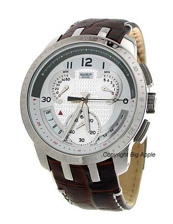 Combining a classic look with cool, modern style, the Swatch Men's Cold Hour Watch features a luminescent gray dial with chrono function, bold numeral indexes, and a striking background pattern. The brushed-silver bezel also features seconds indexes while the unique date display shows an automatically advancing date range of four days in the lower left corner. Paired with a classic, patent leather wristband in dark brown with white stitching, the Men's Cold Hour Watch strikes an ideal balance between traditional and contemporary. The scratch-resistant mineral crystal window protects from daily wear-and-tear. The Swatch Men's Cold Hour Watch is water resistant to 99 feet (30 meters) and powered by Swiss-made ETA quartz movement.