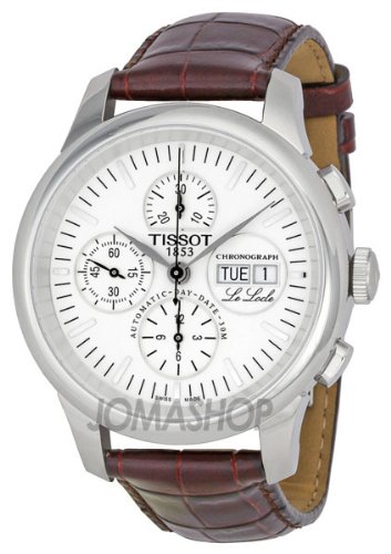 Stainless steel case. Brown leather strap. Silver dial. Day and date displays at 3 o'clock position. Sapphire glass. Index hour indicators. Mechanical auto. chronograph movement. Water resistant at 30 meters (100 feet). Tissot Le Locle Chronograph Mens Watch T41.1.317.31 / T41-1-317-31 / T41/1/317/31 / T41131731