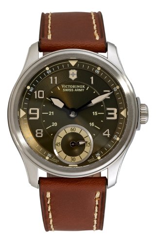 Stainless steel case with a brown leather bracelet. Fixed stainless steel bezel. Olive khaki dial. Manual wind automatic movement. Scratch resistant sapphire crystal. Case diameter: 44mm. Case thickness: 11.9mm. Stainless steel tang clasp. Water resistant at 100 meters (330 feet). Victorinox Swiss Army Infantry Vintage Small Second Mens Watch 241376.