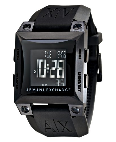 Get this sporty digital watch from A|X Armani Exchange for ultimate functionality and easy style, all the time. Black polyurethane strap. Black ion plated stainless steel square case. Black square digital dial with date, alarm, timer and 24 hour time. Digital movement. Water resistant to 50 meters. Two-year limited warranty.