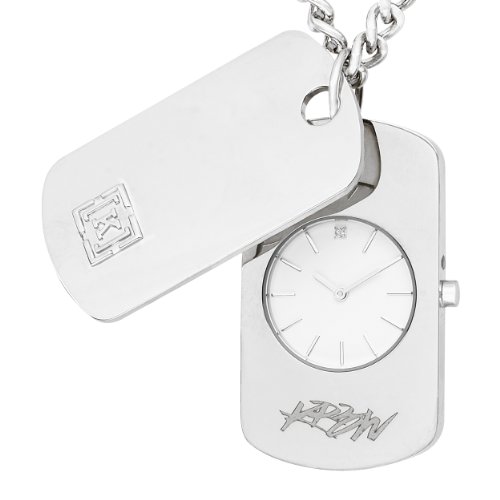 No one will be able to deny your Identity with this dog tag styled watch from KR3W. Three hand Japanese quartz movement. Stainless steel case cover and chain. Hardened mineral crystal. Hook and eye closure. Water resistant up to 30m. Dimensions: Face: 23mm W x 23mm H x 7mm D. Chain Circumference: 31 inches. Pendant: 1 W x 2 H x .25 D. 2-year limited manufacturer's warranty.